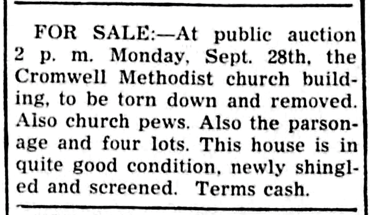 The church building was sold at auction September 28, 1942 with the stipulation that it was to be torn down.