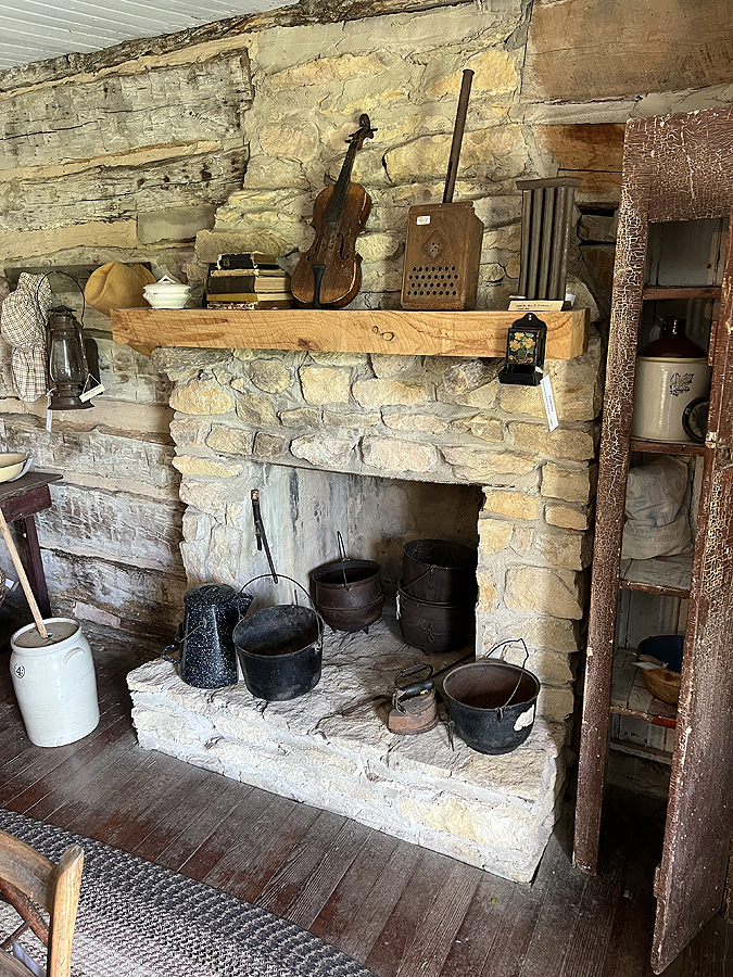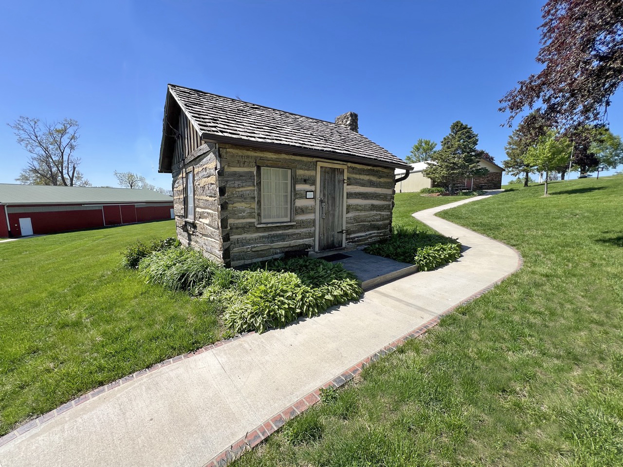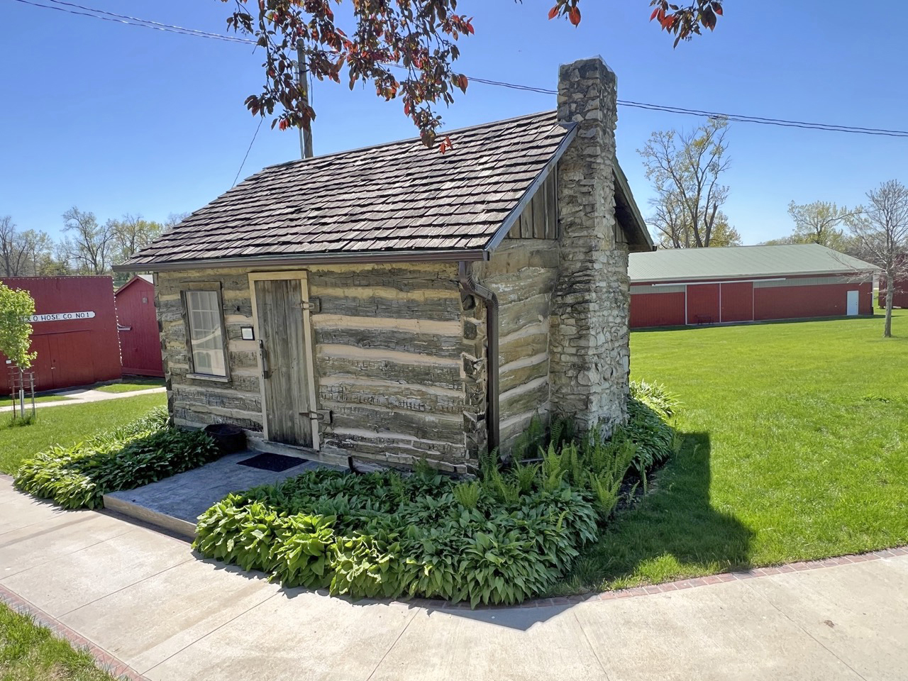 The land on which this cabin originally sat was homesteaded by the Emhoff family in 1855. It was located in Lincoln Township about 6 miles northeast of Creston. It is believed that the cabin was built about this time. In 1906 two additions were added to make it a six room house. The family added rooms to accommodate their nine children. The original cabin became the dining room of a much larger frame home. In 1909 William Emhoff and his bride Stella moved into the house. William passed away in 1930 and Stella and seven children continue to live there until 1955 when their son Harold and family moved into the house. The house was used until November of 1974 and donated to the village in 1975. The fireplace and part of the north wall were added to complete the cabin.