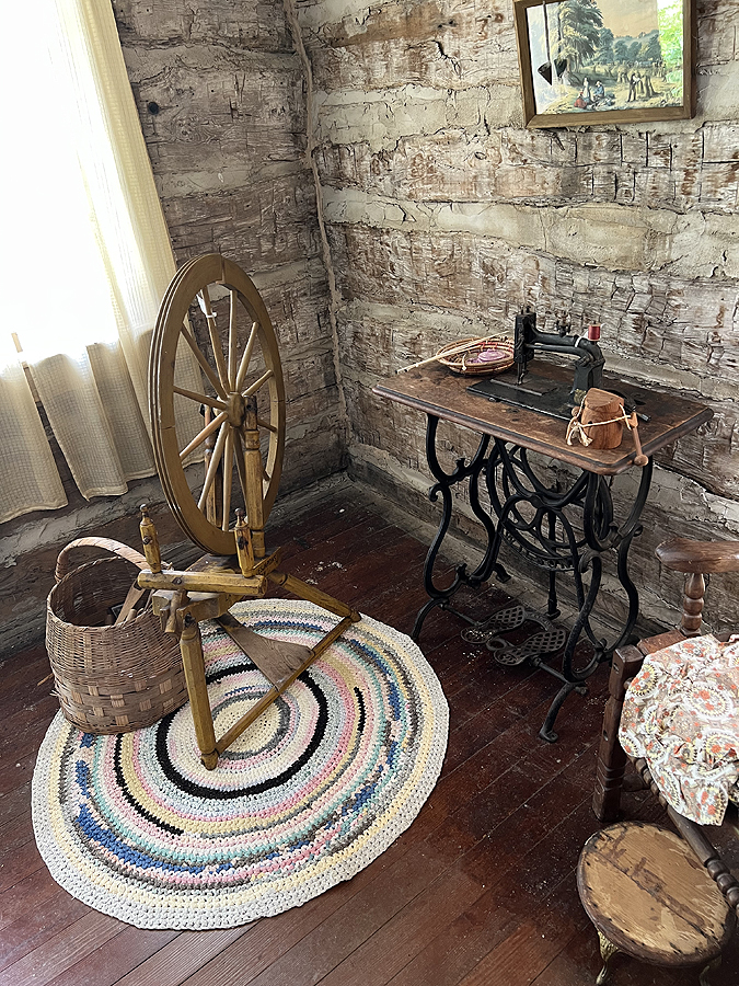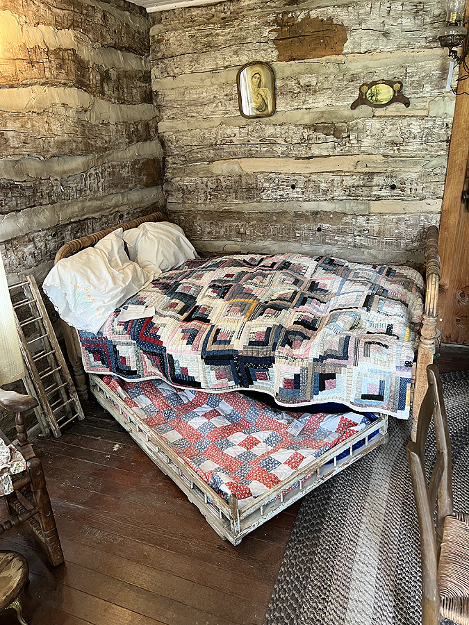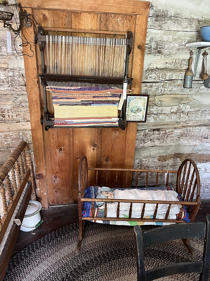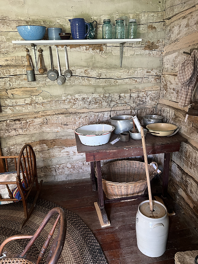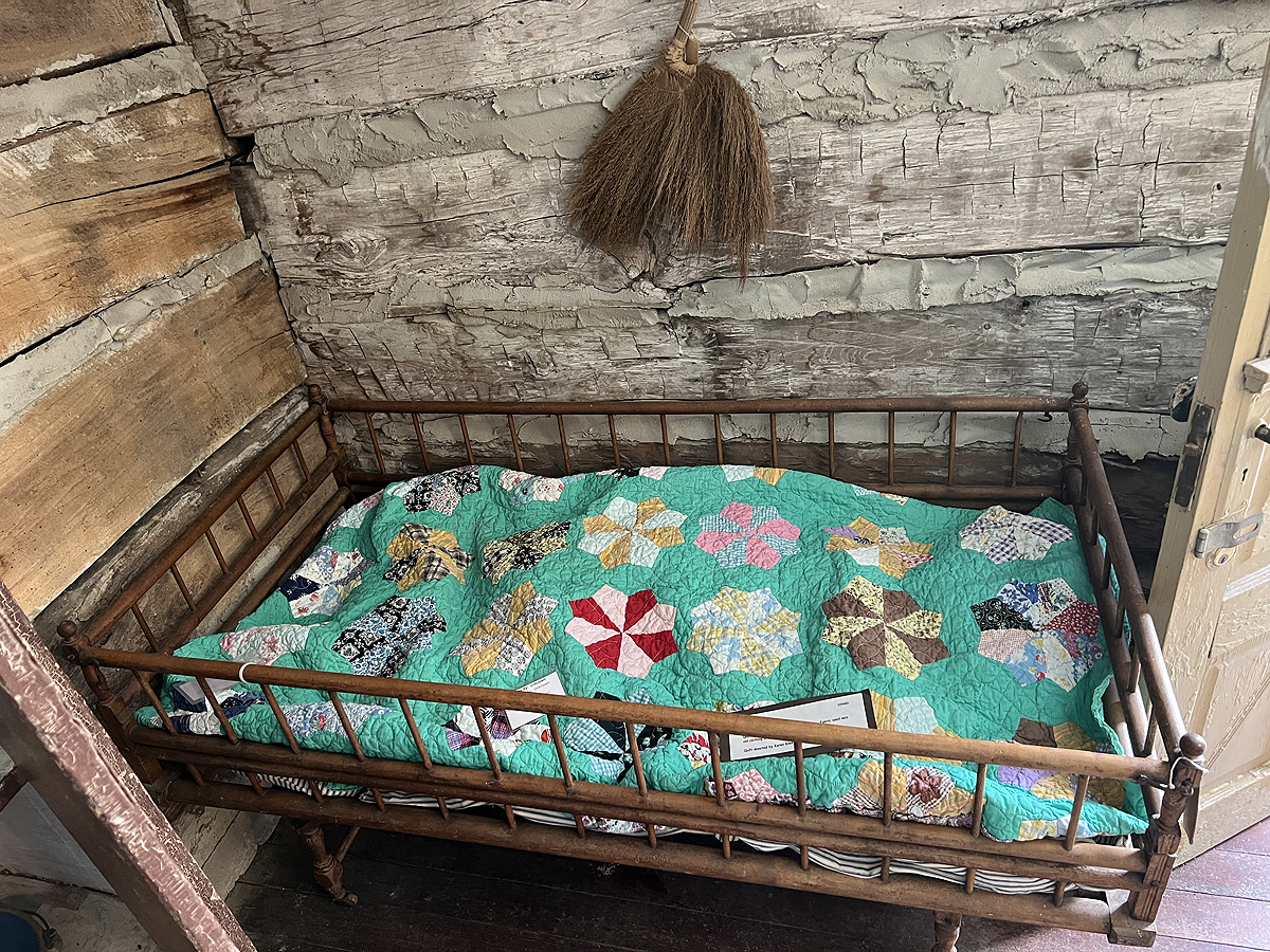 The land on which this cabin originally sat was homesteaded by the Emhoff family in 1855. It was located in Lincoln Township about 6 miles northeast of Creston. It is believed that the cabin was built about this time. In 1906 two additions were added to make it a six room house. The family added rooms to accommodate their nine children. The original cabin became the dining room of a much larger frame home. In 1909 William Emhoff and his bride Stella moved into the house. William passed away in 1930 and Stella and seven children continue to live there until 1955 when their son Harold and family moved into the house. The house was used until November of 1974 and donated to the village in 1975. The fireplace and part of the north wall were added to complete the cabin.