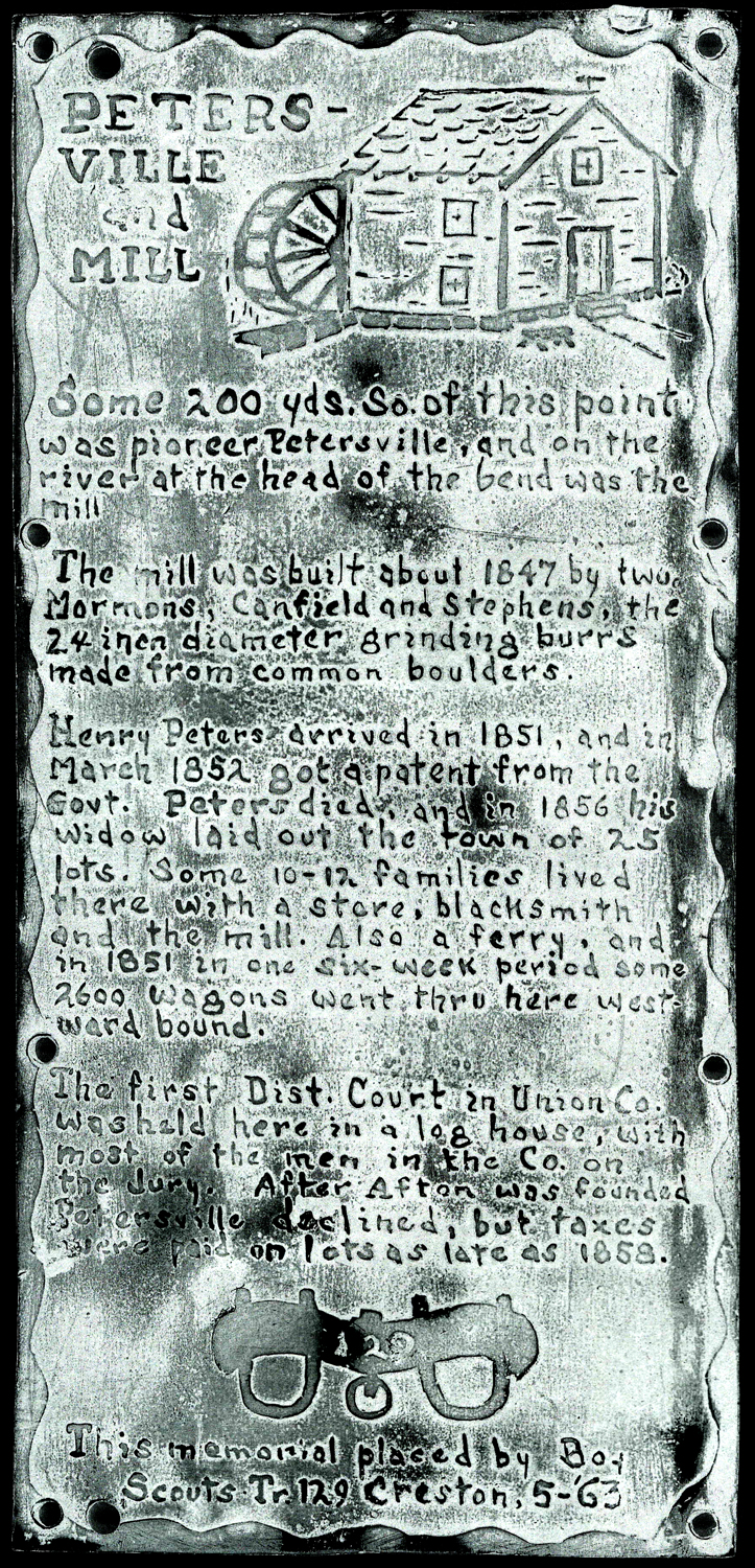 Henry Peters came to Union County in 1851 and located and entered (obtained a deed) land in section 30 of Jones Township. He also acquired some of the property when the Mormons departed in 1852, which included a watermill for grinding grain, which had been built by the Mormons in 1847. Soon after Peters platted a townsite of 25 lots and gave it the name Petersville. At this time the town contained a few log homes that had been built by the Mormons. In the summer of 1852 Petersville was established as the county seat and in September 1853 the first district court for Union County was convened there. Petersville was the only town in the county to have ferry service, which was used to cross the Grand River when water levels were too high for wagons to ford the river. In the following year, a general store and blacksmith shop were additions to the town. Interest in the town soon faded with the establishment of the Afton as the county seat in 1855. The last mention of Petersville in County records was 1858.