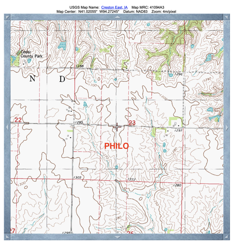 Philo was a post office located in Highland township. No definitive record of its exact location has ever been found. It is one of the post offices that may have changed locations over time. A modern day topographical map by the United States Geological Survey shows the historical location of Philo to be on a ridge just west of the center of section 25, which matches most period maps that show it located on the road between Afton and points West. However, one map shows Philo to be located south of the town of Highland. This is quite possible because in later years the main east-west road shifted further south a mile and Philo post office may have been relocated to the new main road. Records in the book, Iowa Post Offices, 1833–1986, by Alan H Patera & John S Gallagher, 1986, show that Philo was a post office from 1856-1864. The Post Office may have been named for Philo Clark, one of the founders of the town of Highland.