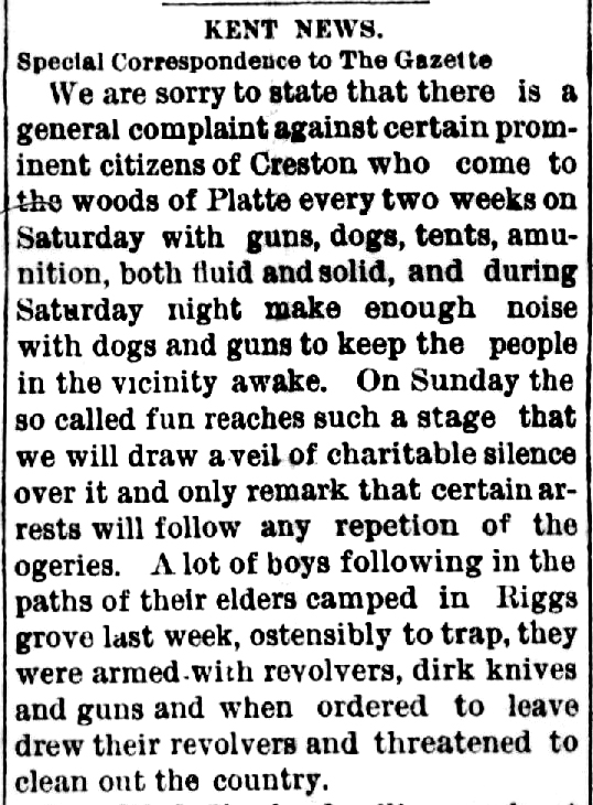 Riggs Grove was established in April 1854 by Samuel Riggs. It was located in section 30 of Douglas Township. Riggs Grove is where the Pisgah to Glenwood weekly mail route crossed the Platte River. The post office, whose official name was Platte, was the first in the township. At that time, Platte Township comprised almost the western half of Union County. Samuel Riggs was also the first justice of peace in the western part of Union County. Weekly stage coach service also followed this trail.