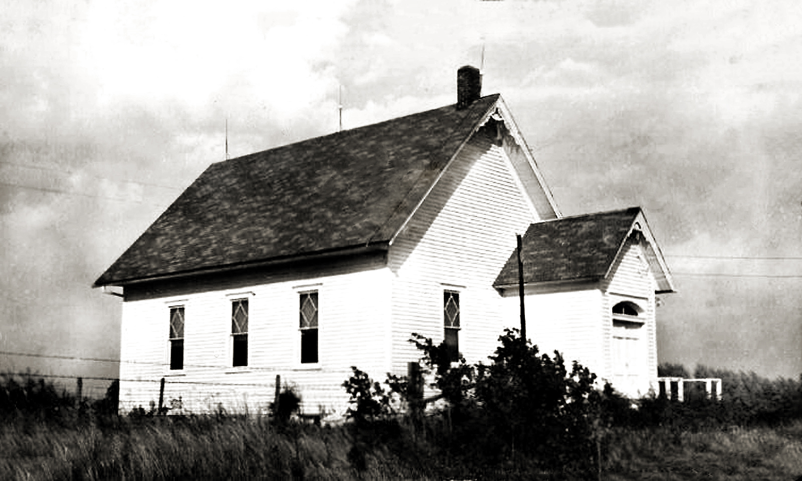 In 1891 the South Valley United Evangelical Church was erected in the Southeast corner of section 11, Grant Township for $1500. The land was donated by the Oakes family. The church was struck by lightning and burned on July12, 1915. A new church, with basement, was built for $3000 and dedicated January 16, 1916. Sometime in the 1950s the Evangelical Church was merged with the United Brethern Church and services ceased. The South Valley Ladies Quilters continued to meet at the church building, their last meeting at the church being November 4, 1959, but the group continued quilting for many years at other locations. The building was torn down about 1960 by Carl Eklund.