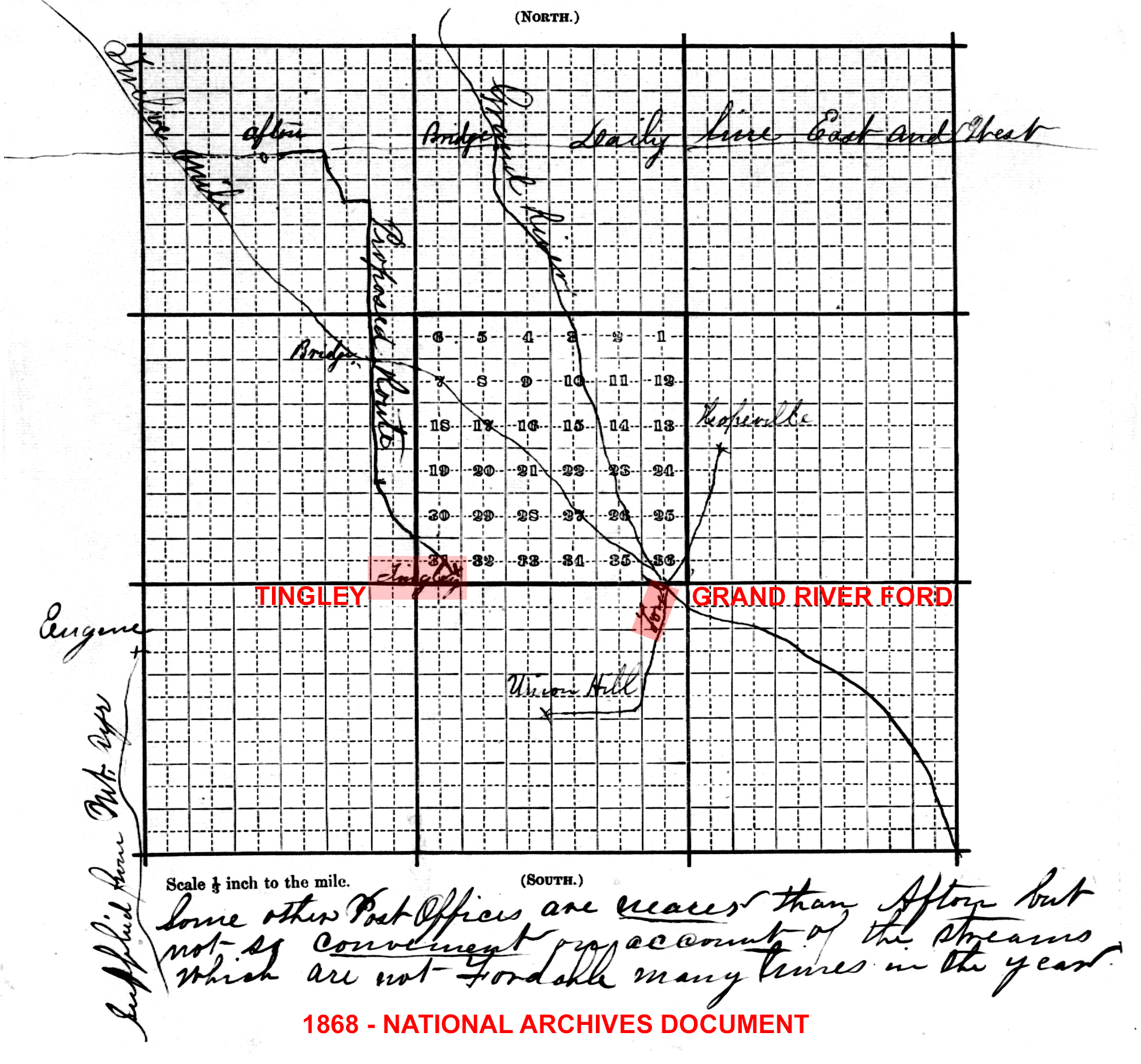 The only confirmed location for the Tingley Post Office comes from a National Archives document dated March 6, 1868. It gives the location as the south east quarter of section 31, Pleasant Township. See map below.