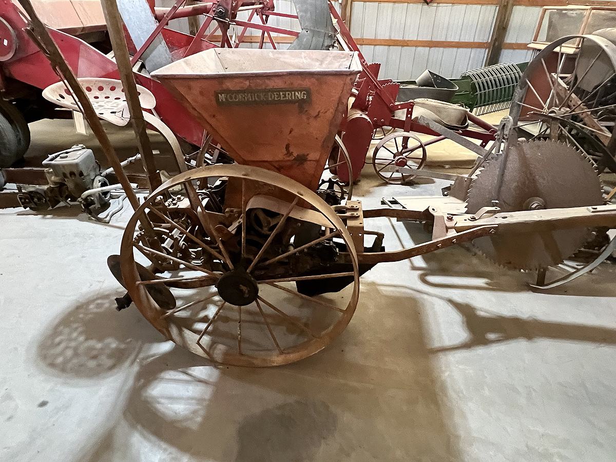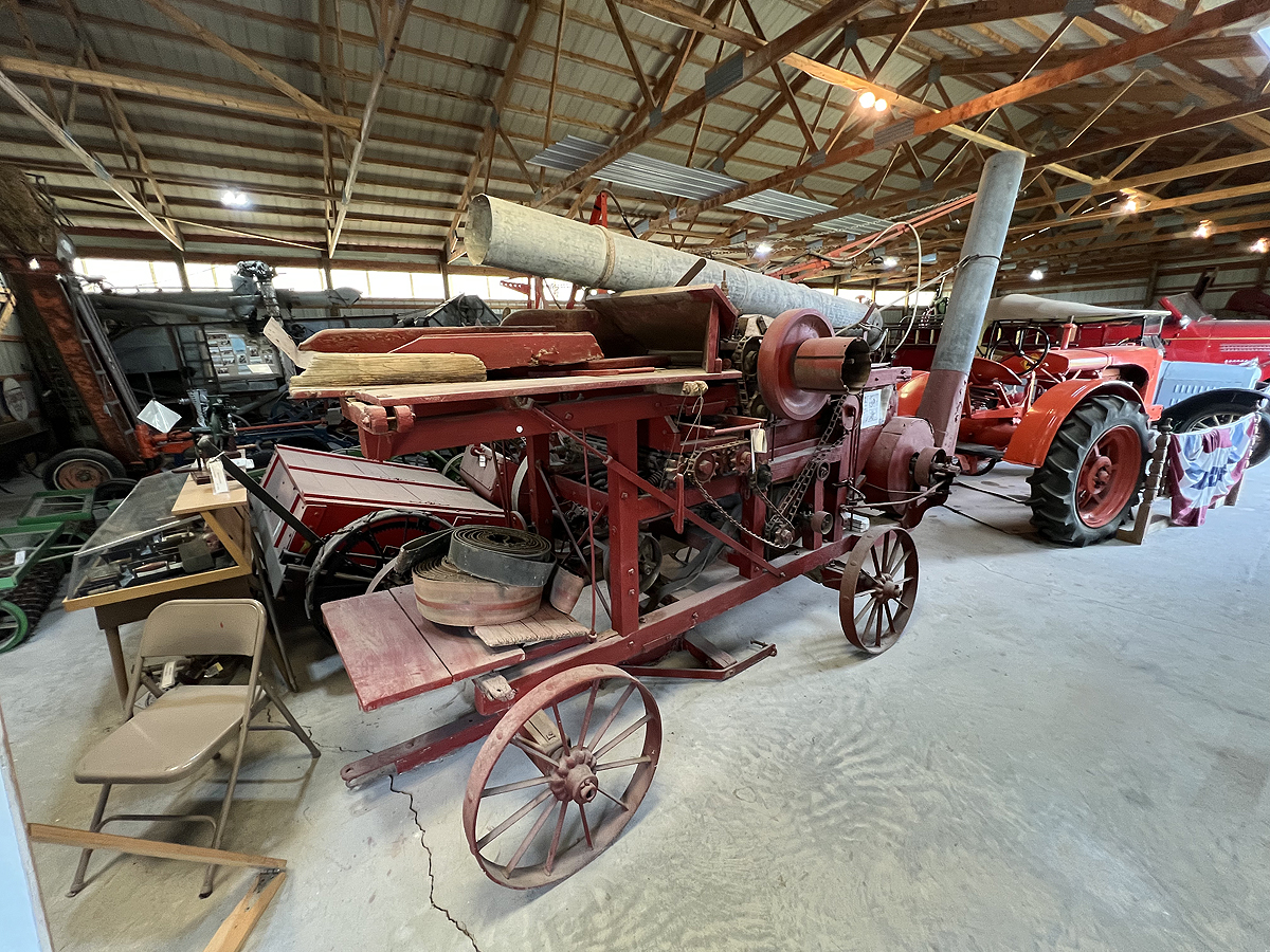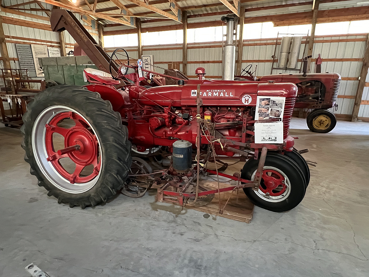 The metal machine shed was built in 1979 to house equipment from the era of tractor drawn equipment. Some of the farm equipment displayed are: threshing machine, combines, hay balers, side rake, blue grass stripper, corn picker, and field sprayer. Also on display or a 1916 Maxwell touring car, a 1917 model T Ford touring car and a Seagrave fire engine.