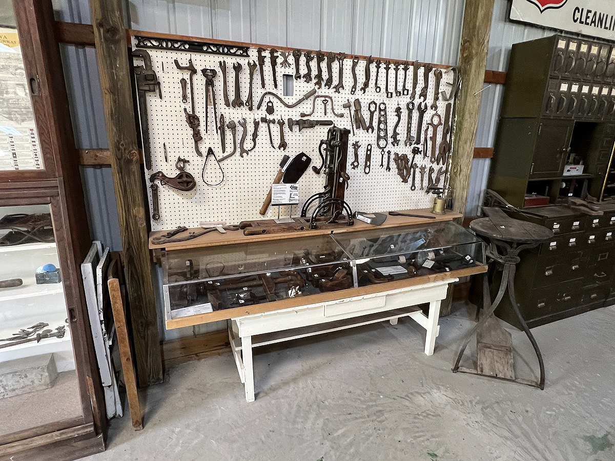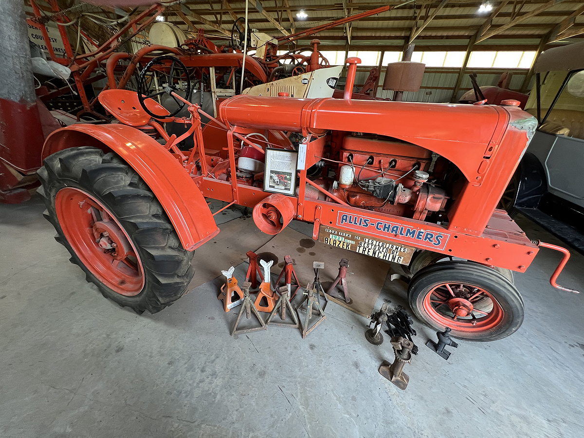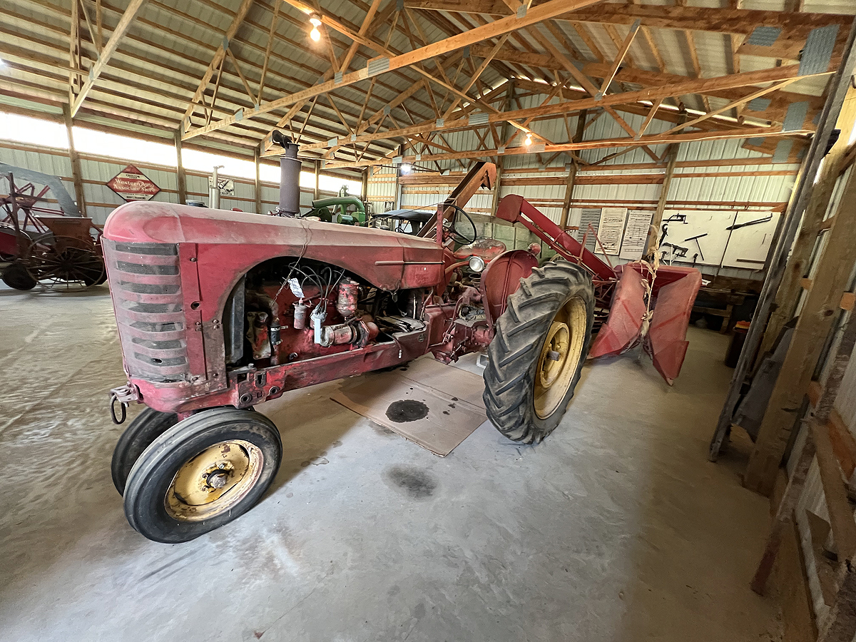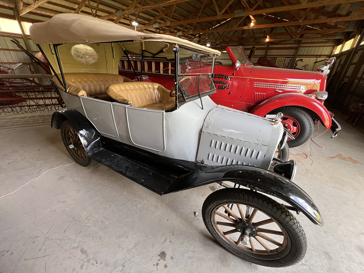The metal machine shed was built in 1979 to house equipment from the era of tractor drawn equipment. Some of the farm equipment displayed are: threshing machine, combines, hay balers, side rake, blue grass stripper, corn picker, and field sprayer. Also on display or a 1916 Maxwell touring car, a 1917 model T Ford touring car and a Seagrave fire engine.