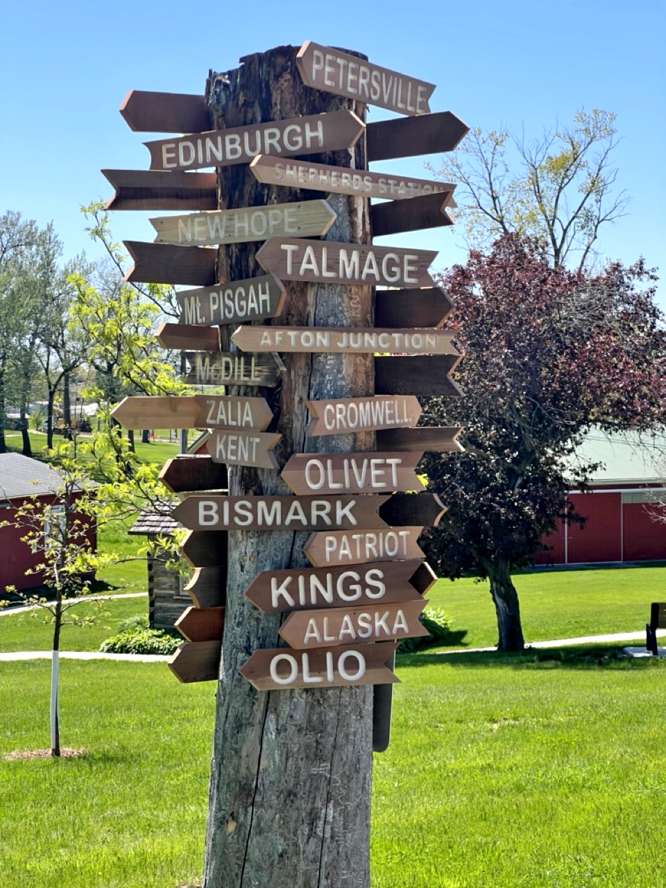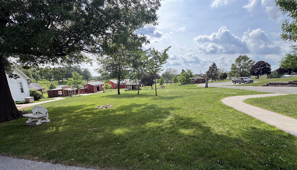 We like to refer to the green space in the center of our Village as the Village Commons. From this central space, all the buildings in the village are visible. The time capsule is located here as well as the fire pit that we use for campfire cooking demonstrations on the 4th of July. The tall sign post on the Village Commons lists all of the abandoned towns and post offices that were in Union County, as well as all the towns that presently exist.